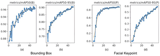 Mean average precision () progression during training. (a,b) show @0.50 and @0.50–0.95 for bounding boxes for cow face detection, and (c,d) show @0.50 and @0.50–0.95 for keypoint detection, all measured across 50 epochs.
