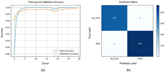The LSTM model was trained to classify ‘pain’ versus ‘no pain’ sequences based on the extracted facial features. The training and validation accuracy curves (Figure 11a) reveal rapid convergence: the validation accuracy surpassed 98% by epoch 5 and steadily approached 99.5% by epoch 30. The close alignment between the training and validation curves indicates minimal overfitting and suggests that the LSTM model effectively learned to recognize the temporal patterns in pain-related facial behavior while maintaining strong generalization. Although the training and validation performance is promising, we should keep in mind that the model used a limited amount of data, and the frames chosen for training and validation had some similarities, as they were from sequential frames containing a fair amount of similarity.