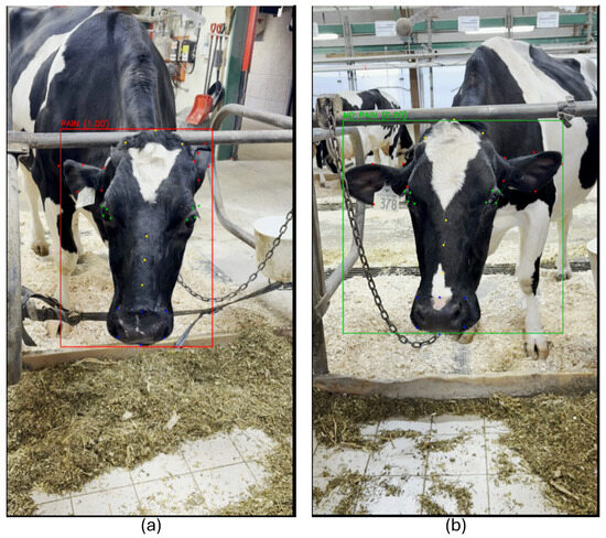 The inference pipeline was designed to enable real-time, frame-level pain detection and robust video-level classification. For each incoming video frame, the YOLOv8-Pose model detects the cow’s face and extracts 30 facial landmarks. Using these landmarks, the three predefined ROIs—the eyes, ears, and mouth—are cropped and resized to 96 × 96 pixels. Each ROI is processed through the pretrained MobileNetV2 to extract deep visual feature vectors, which are concatenated into a single descriptor representing the frame. A sliding window buffer stores the five most recent frame descriptors. Once filled, the concatenated sequence is passed to the trained LSTM model, which outputs a probability score indicating the likelihood of pain. A threshold of 0.5 is applied to classifying the sequence as “PAIN” or “NO PAIN”. The predicted label is overlaid onto the video frame, along with a color-coded bounding box around the detected face, providing an intuitive visual indicator.