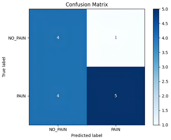 The LSTM model was trained on ten video recordings: six labeled as ‘pain’ and four as ‘no pain’. The ‘pain’ videos on average contained 3882.5 frames each, while the ‘no pain’ videos had 4804 frames on average, resulting in a mild temporal imbalance that was carefully accounted for in the evaluation metrics. Training was conducted over 30 epochs with a batch size of 32, using the Adam optimizer, binary cross-entropy loss, and a rate of 0.5 dropout. An 80:20 split was used for the training and validation sets. The LSTM’s ability to model temporal dependencies allows the system to detect subtle, transient facial movements indicative of pain that static frame-based classifiers might miss. The combination of MobileNetV2 feature extraction and LSTM temporal modeling balances the computational efficiency with the capacity to capture complex spatiotemporal patterns.