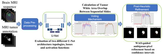 Figure 1 provides an overview of the proposed pipeline. Each axial fluid-attenuated inversion-recovery (FLAIR) slice, together with its manual tumor contour, first undergoes a brief pre-processing step. The prepared slice is then segmented by one of two backbone networks, a vanilla U-Net or an Attention U-Net, trained under different loss functions and output activation functions. After slice-wise masks are produced, a voting mechanism based on the white area overlap computes the cross-slice overlap curve, smooths it with a Gaussian filter, and pinpoints the peak and subsequent decline. Within this post-peak window an early-stop heuristic re-labels a small percentile of low-confidence pixels, removing or adding them as needed.