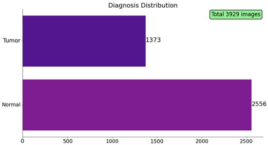 Diagnosis distribution across the 3929 FLAIR slices in the TCGA-LGG dataset. Bars report the absolute number of images labelled tumor (positive mask) and Normal (empty mask).
