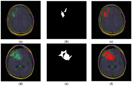 MRI slice-level examples from patient with ID “TCGA_CS_4941_19960909”. (a,d) Raw FLAIR images; (b,e) ground truth binary expert masks; (c,f) image–mask (red) overlays.