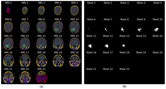Figure 4a stacks all 23 slices available for the same patient in cranio-caudal order. The sequence reveals how the cranial vault initially appears tumor-free and gradually opens to reveal the lesion, which then enlarges before disappearing again. Figure 4b presents the ground truth masks for those 23 slices without the underlying MRI signal, emphasizing the sparsity of positive pixels in many frames.