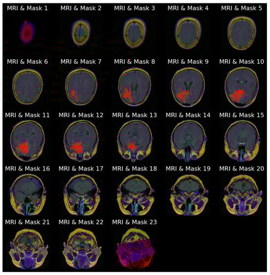 Image–mask (red) overlays for all 23 slices for patient with ID “TCGA_CS_4941_19960909”.
