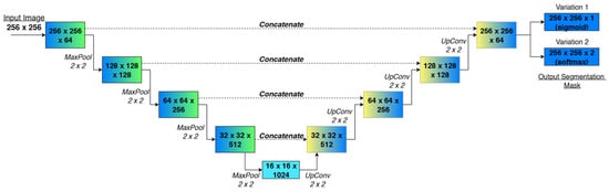 Figure 6 presents an overview of the four-level U-Net used in this study. Blue–green boxes on the left form the encoder: each block halves the spatial resolution, from 256 to 16 pixels, while doubling the number of feature channels, from 64 gradually to 1024. Yellow–blue boxes on the right form the decoder: transposed-convolution (“UpConv”) blocks restore resolution back to while successively halving channel depth. Dashed grey arrows indicate skip connections that copy high-resolution features from the encoder to the decoder; solid arrows denote the main forward path. Furthermore, Figure 6 shows the two different U-Net approaches with two output heads: one with a single-channel sigmoid and one with a two-channel softmax.