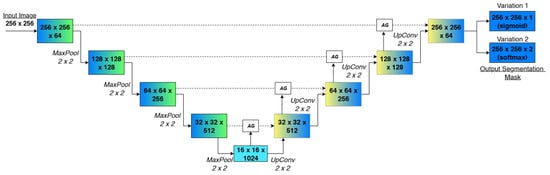 Attention U-Net retains the depth, filter sizes and skip topology of the vanilla U-Net architecture but inserts a learnable Attention Gate (AG) on every encoder–decoder shortcut. Each AG receives (i) the semantic context emerging from the decoder at a given scale and (ii) the fine, localization-rich features streamed from the matching encoder layer. Through a lightweight gating mechanism composed of convolutions, element-wise addition, a single sigmoid activation and up-sampling, the gate generates a spatial attention coefficient that modulates the encoder features before fusion []. Consequently, irrelevant or noisy regions are weakened, while spots likely to belong to the tumor are emphasized, and all with only a small computational overhead of less than 5%.