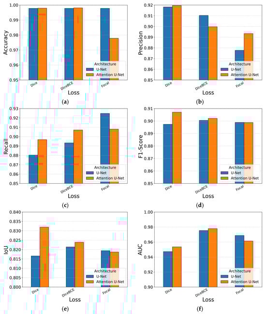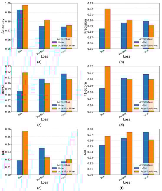 In terms of training dynamics, focal loss generally requires close to the full 100 epochs, whereas the other two losses seem to be able to converge even 20–25% sooner. Figure 8 reinforces the narrative: orange columns, which represent Attention U-Net, sit just above their blue counterparts for most losses, while Dice columns dominate the IoU and F1-score subfigures.