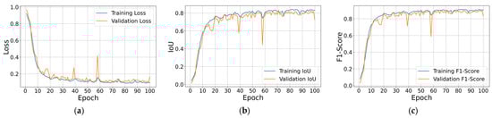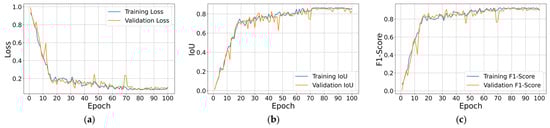 Both U-Net and Attention U-Net were trained for 100 epochs with a batch size of 8. Weight tensors were initialized with the recommended variance-preserving scheme for ReLU layers, and all models were optimized with Adam, with a learning rate of . Adam optimizer [] was preferred over Stochastic Gradient Descent (SGD) [] because preliminary experiments produced higher training and validation scores. The learning rate followed a simple linear decay schedule that reached zero at the final epoch. No explicit weight decay or dropout was required to control over-fitting.