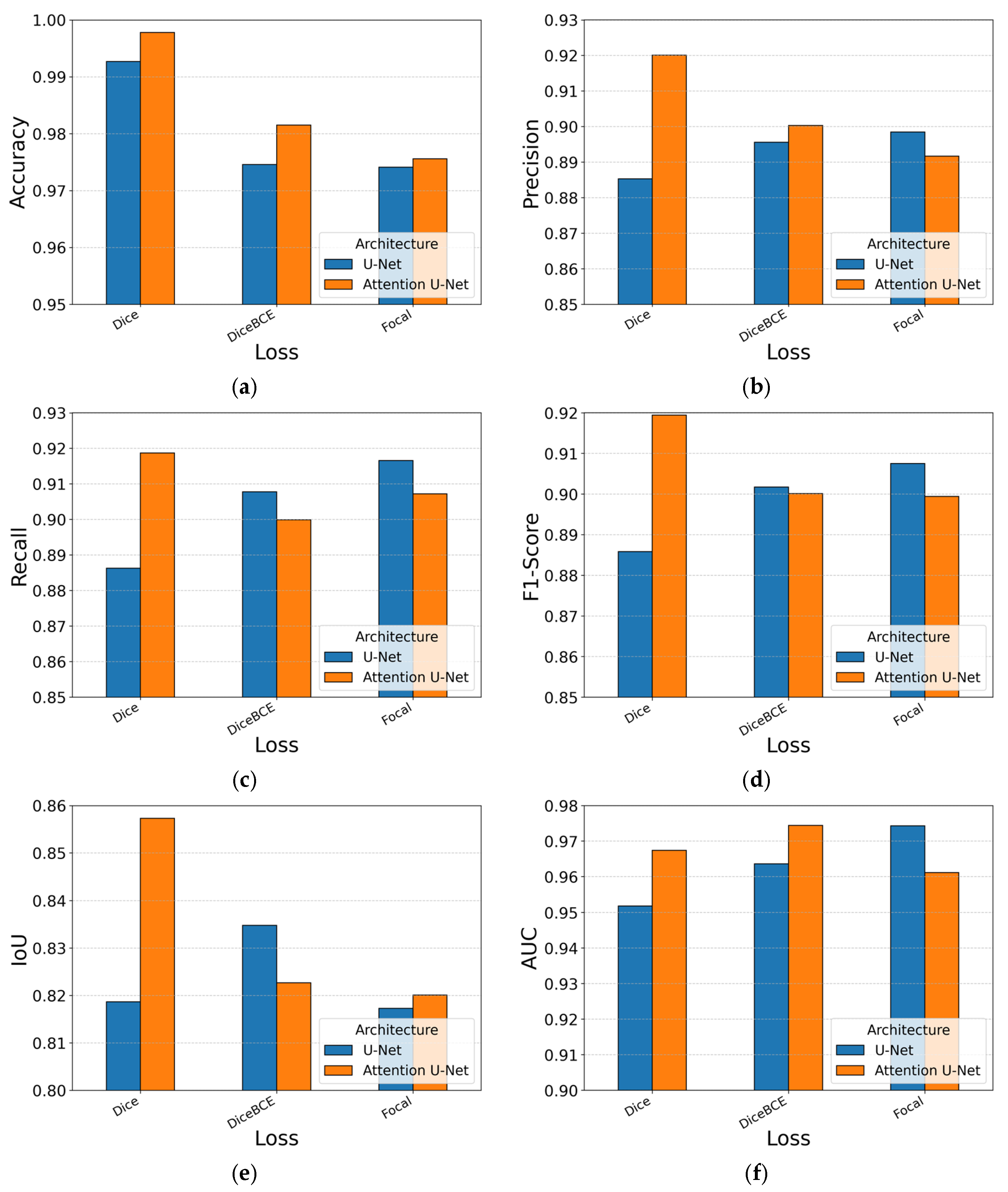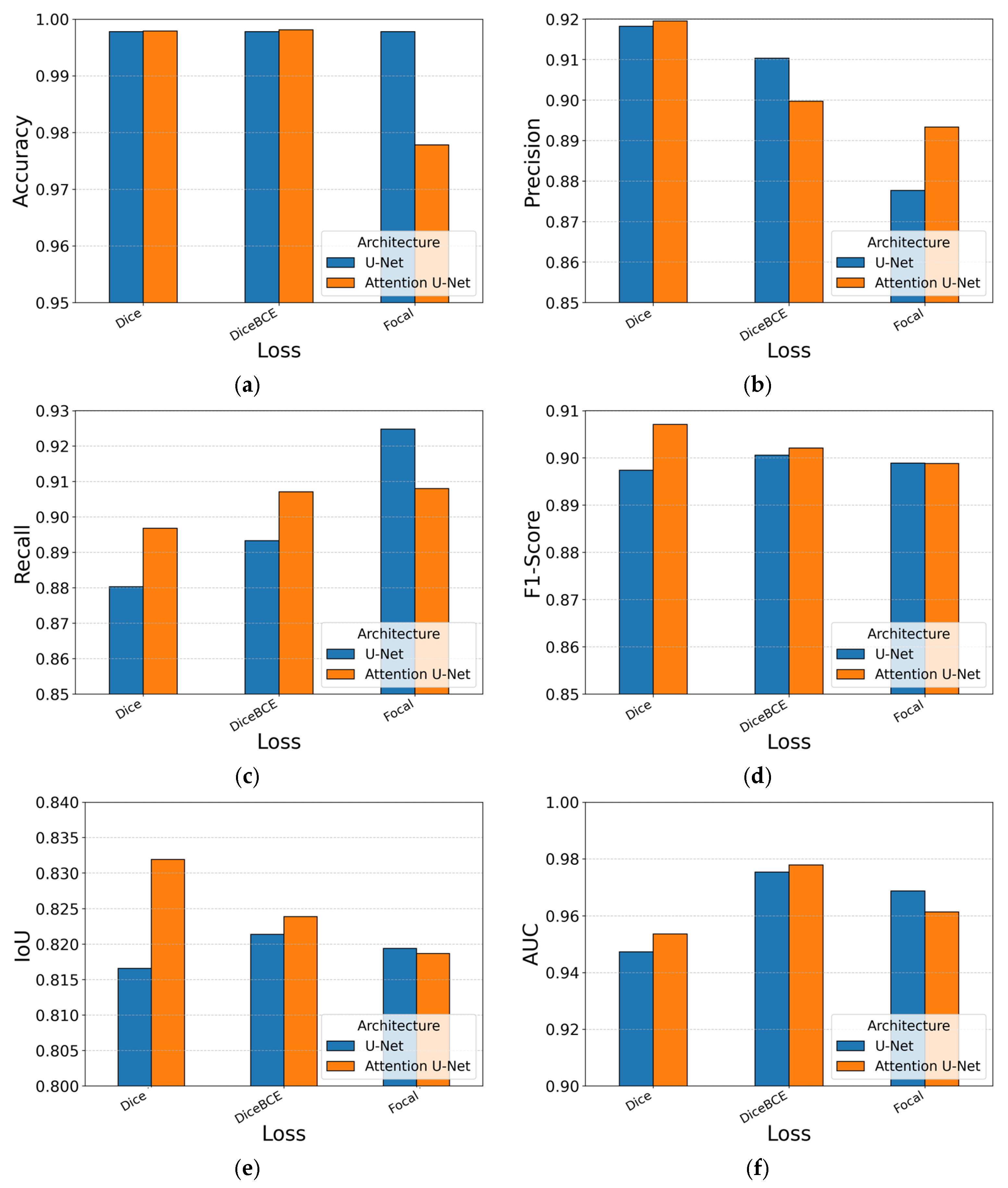 - Abraham, N.; Khan, N.M. A Novel Focal Tversky loss function with improved Attention U-Net for lesion segmentation. arXiv 2018, arXiv:1810.07842. [Google Scholar] [CrossRef]