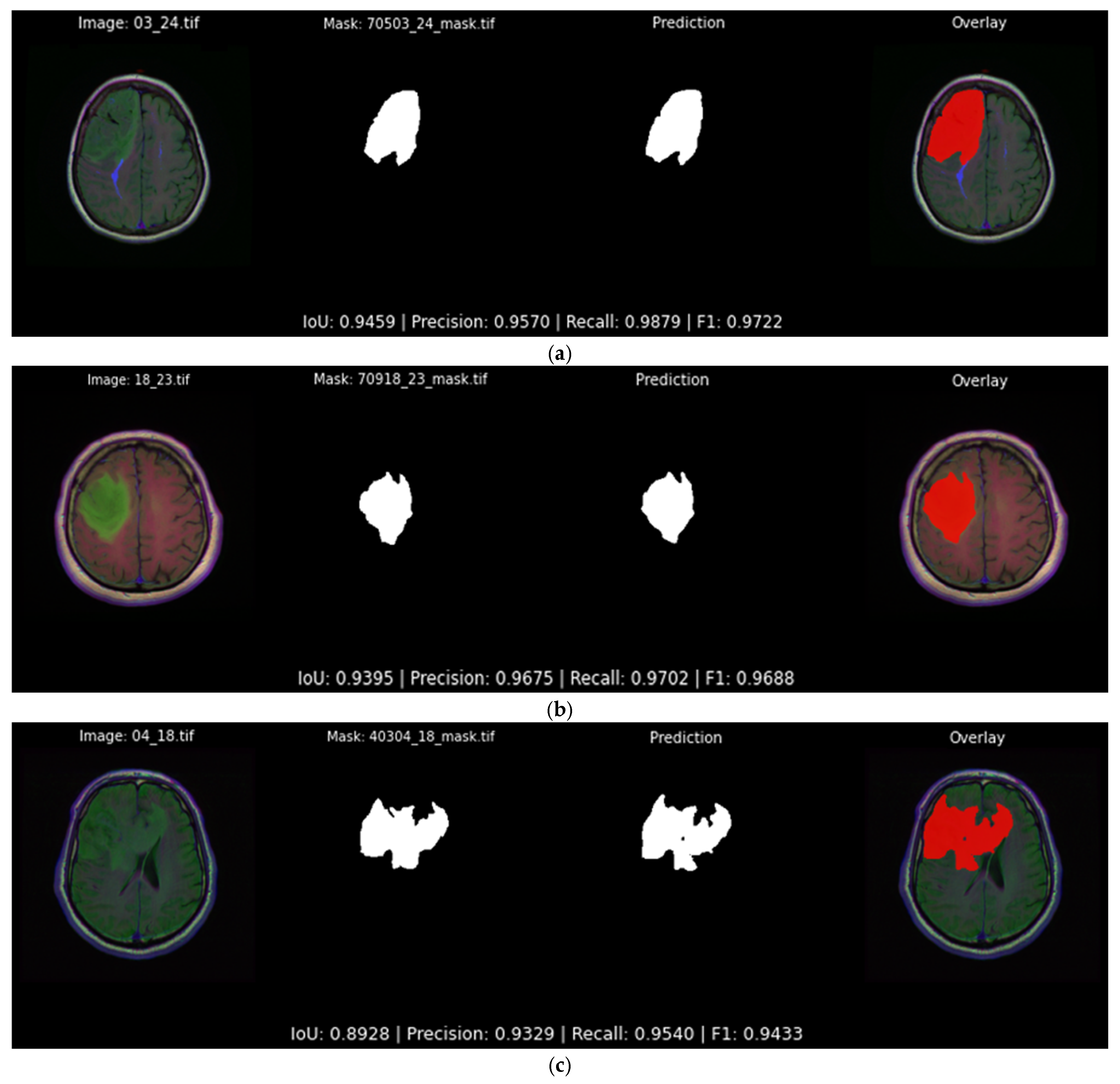 Accurate segmentation | Figure 13 | Predicted masks closely follow tumor boundaries and details | 0.946, 0.940, 0.892 |