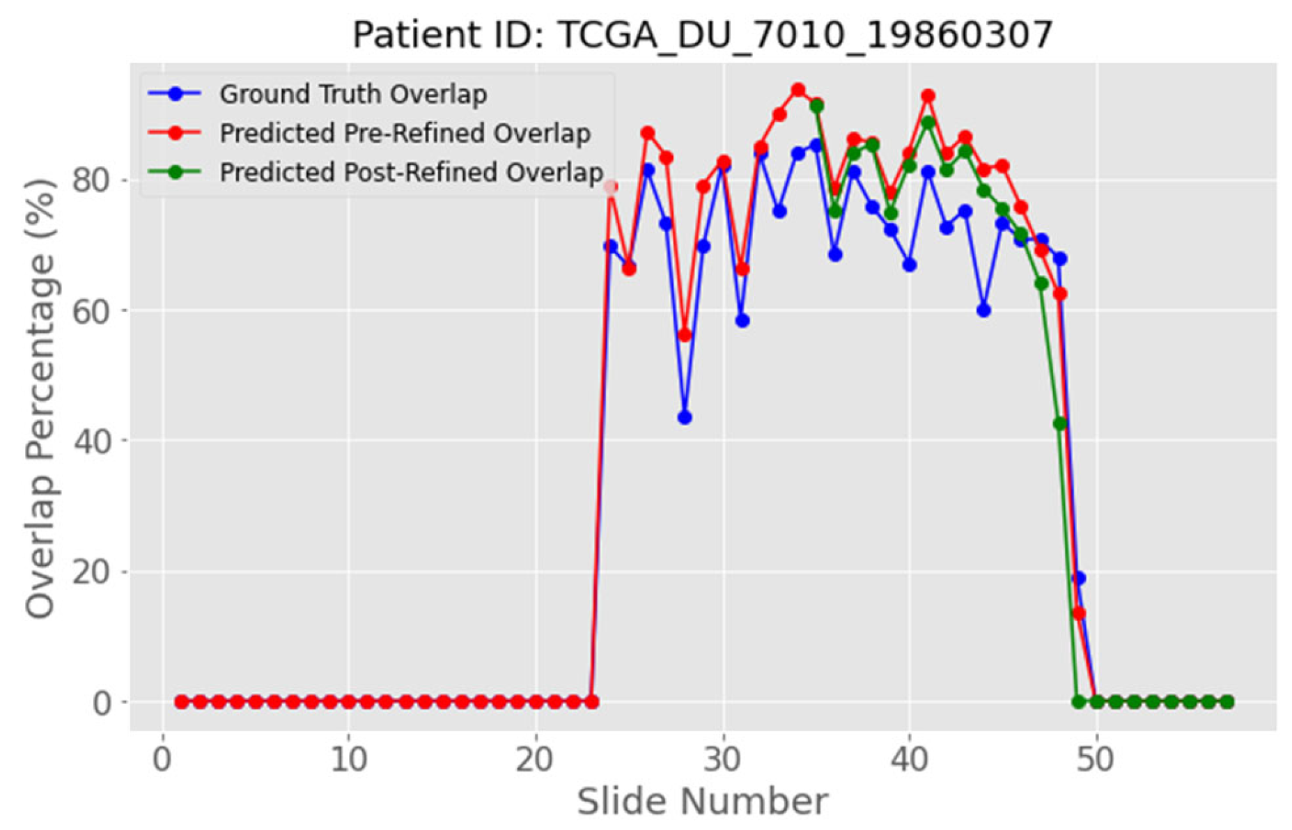 Inaccurate segmentation | Figure 14 | Fragmented or under-segmented predictions, especially for complex tumor morphologies | 0.599, 0.598, 0.378 |