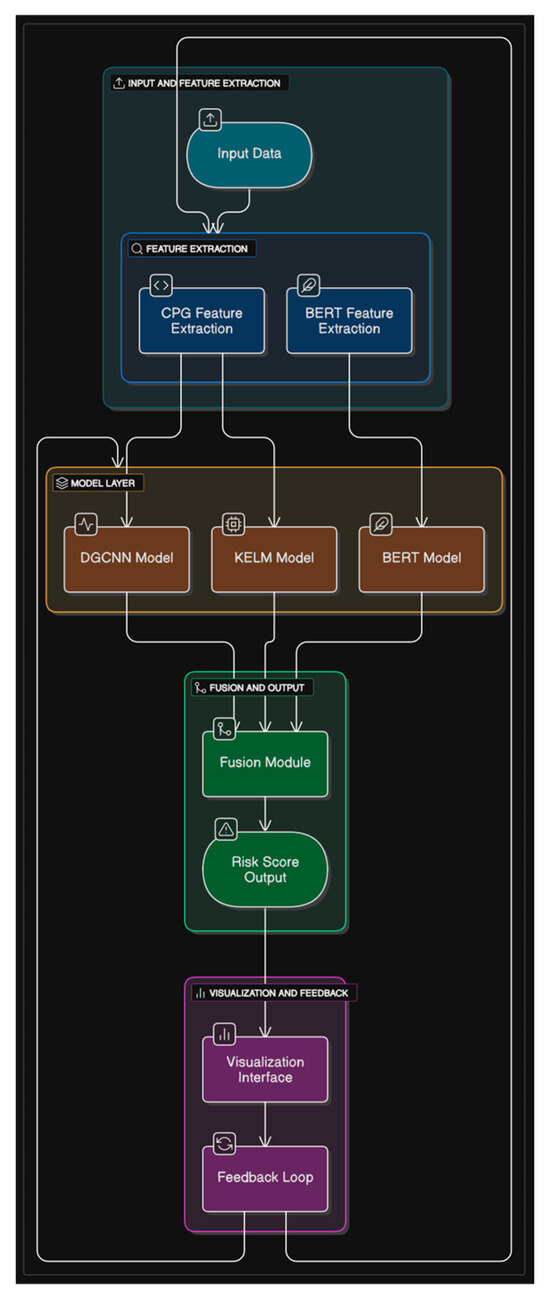 A key innovation of this framework is its reinforcement learning-based dynamic fusion of predictions from the three core models—BERT, DGCNN, and KELM.