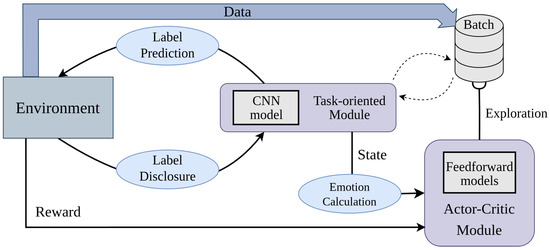 In the framework, three models were implemented: the task-oriented, actor, and critic models. This combination was loosely inspired by human neural functioning during a psychological experiment, where part of the brain is focused on task success (e.g., prefrontal cortex), which is mediated by feedback from other regions (e.g., basal ganglia). It constituted each artificial participant, being fed data for classification with potentially wrong labels. This biological parallelism was purposeful so that the obtained results could be contrasted with behavioral studies with adequate validity, in line with answering RQ1 and fomenting human–AI interdisciplinarity in state-of-the-art research. Furthermore, this clear separation between the task-oriented module and emotion to exploration optimization expands on current AI exploration techniques, which usually combine them and disregard bio-inspiration.