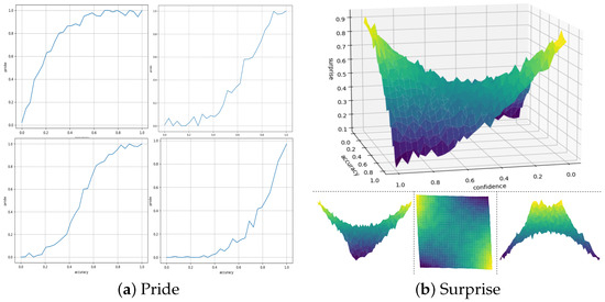 We propose deriving epistemic and achievement emotion from the standard performance metrics of a deep learning methodology, interpreting them as underlying cognitive conditions. Specifically, testing accuracy reflects the adequacy of a model towards some task by gauging overall correctness over unseen data. Therefore, it may be employed as a pointer of error and achievement. In this case, escalation in accuracy scores can be interpreted as increasing success. Contrastingly, de-escalation entails a decrease in success. Variations in the feeling of pride should therefore match variations in accuracy, corresponding to personal achievement or lack thereof [37]. This accuracy–pride match can entail a curve with a positive slope and unknown convexity, with small variations. Factoring in confidence, besides accuracy, can broaden the set of representable emotions. For instance, high-confidence errors trigger the feeling of surprise, as derived from the cognitive incongruity explained previously. Additionally, insecure attainment of success may also induce surprise [38]. In these scenarios, a respective decrease or increase in confidence will instead lower surprise. A saddle-like behavior can therefore describe this emotion, as polarized variations of accuracy and confidence together imply intense values of surprise, whilst matching magnitudes of the two indicate a reduction or lack of this emotion. This view regarding surprise and pride is widely backed by the cognitive psychology literature [12,13,20,21].