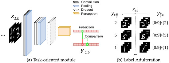 (a) The VGG-like model trained and employed in the framework for a classification task and (b) label adulteration of the MNIST training data against respective visual content.