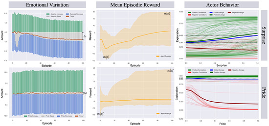 As episodic cumulative reward validates the success of the learning cycle, observed emotional fluctuations over time are also legitimized. These are presented in the first column of Figure 5. Expectedly, the initial variation is well-balanced for both emotions, as the number of increases matches that of decreases in the first episode. However, different outcomes manifest as episodes progress: