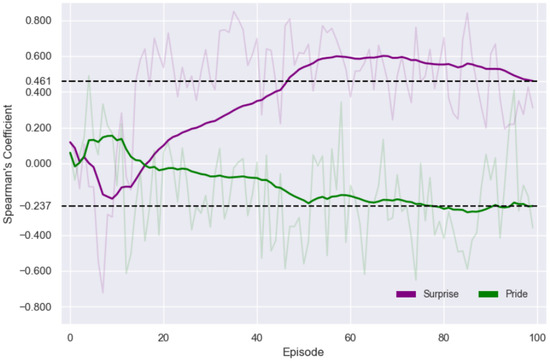 Relationship strength between exploration and pride/surprise can be further demonstrated by measuring how each data pair correlates throughout a cycle. Here, we employ Spearman’s correlation coefficient [49] at each episode in an agent’s cycle. This assesses if observed monotonic relationships between emotion and exploration (Figure 5 third column) become increasingly robust over time. Resulting coefficients for either experiment, with per-episode averaging of all 250 agent sample pairs, are shown in Figure 6. These demonstrated considerable variability in the strength of the correlation between exploration and surprise/pride. To mitigate this effect, a sliding window encompassing 40 episodes was applied to smoothen the trends and clarify strength progression. Both cases display near-zero coefficients in earlier episodes. However, this mean increases for surprise while decreasing for pride, resulting in and by the end of the cycles. This evidences a moderate positive correlation for surprise and exploration. For pride, there is instead a negative and much weaker association with this behavior. Succinctly, this weakness is congruent with the disparity of having positive cases 10 times more common than negatives ones while still obtaining a negative correlation.