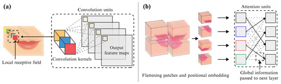 These cumulative limitations have prompted a shift toward attention-based models for VSR. As illustrated in Figure 1a, 3D CNNs extend traditional 2D convolutions by incorporating the temporal dimension, thereby enabling simultaneous extraction of spatial and temporal features. This layerwise convolutional processing facilitates localized spatiotemporal learning across frames. However, 3D CNNs are fundamentally limited by their fixed receptive fields, which hinders the modeling of long-range temporal dependencies. In addition, their computational demands increase significantly because of the large number of parameters introduced by added temporal dimensions [8,14,15]. These limitations have motivated the transition toward attention-based models, such as transformers, which can more effectively capture the global context in spatiotemporal data.