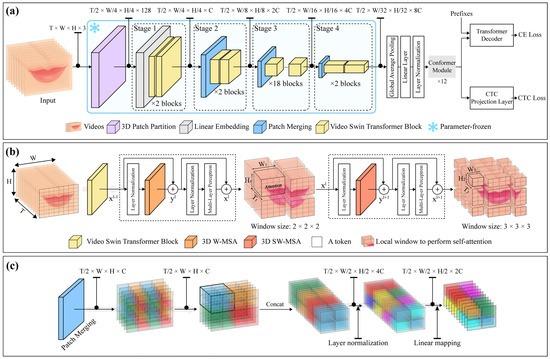 Proposed Dual-Stream Former pipeline for visual speech recognition: (a) stage-wise processing of visual input via 3D patch partitioning, Swin Transformer blocks, and patch merging, followed by back-end Conformer and decoder; (b) internal structure of Swin Transformer blocks highlighting multi-head attention mechanisms; (c) patch merging and linear mapping operations.