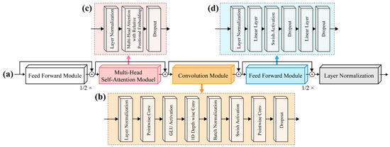 The overall structure of the Conformer encoder block is illustrated in Figure 3, where (a) and (d) correspond to the feedforward modules, (b) denotes the convolutional module, and (c) represents the self-attention module. This arrangement enables the balanced modeling of both local and global temporal features.