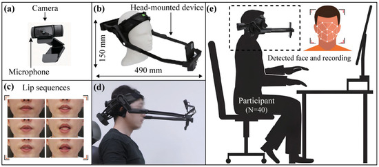 The recordings were captured using a custom-designed head-mounted device to ensure consistent alignment and resolution across all sessions, as illustrated in Figure 4. The Logitech C920 HD PRO webcam (Figure 4a) mounted on the head-mounted device was positioned 490 mm from the participant’s face. This setup ensured consistent frontal-pose capture and minimized variability owing to head movements (Figure 4b,d,e). Videos were recorded at a resolution of pixels (FHD) and frame rate of 30 frames per second (fps). Each participant pronounced 185 independent word classes, including letters, numbers, emotions, and daily vocabulary. Each keyword was recorded for 3 s and repeated 100 times, resulting in 740,000 utterances. In total, the dataset used for modeling comprised 740,000 video utterances (616.67 h) across 185 classes from 40 speakers (20 females, 20 males). The recording environment was optimized to minimize external influences, such as light.