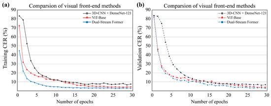 Comparison of training (a) and validation (b) CERs across epochs for different visual front-end architectures.