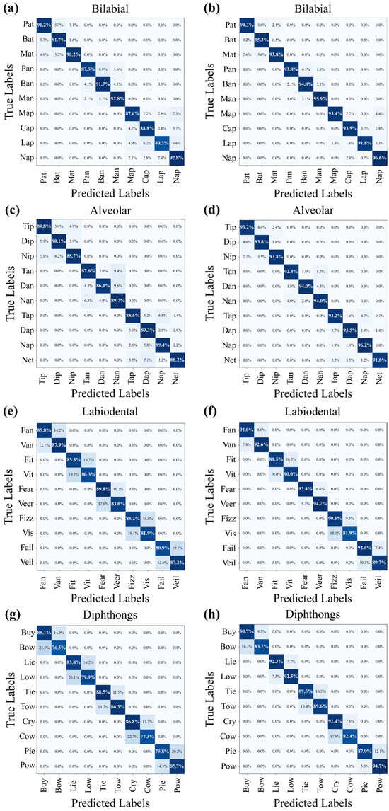 Produced by closing and opening the lips, these sounds offer relatively clear visual cues, yet their lip shapes are nearly identical, making them challenging to differentiate (Table 4a).