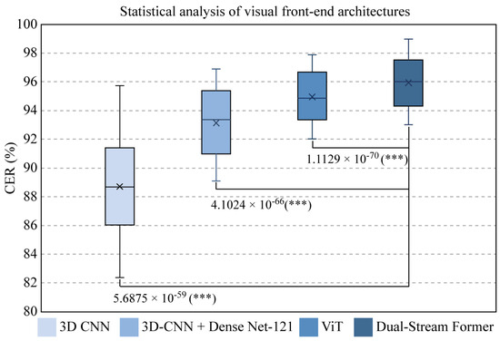Statistical comparison of CER across four visual front-end architectures: 3D CNN, 3D CNN with DenseNet-121, ViT, and Dual-Stream Former. Box plots represent CER distributions across 10 participants, with mean (×) and median (line) indicated. Paired t tests revealed statistically significant improvements of Dual-Stream Former over all other models, with corresponding p values and effect sizes (Cohen’s d): 3D CNN (p = 5.6875 × 10−59, d = 2.41), 3D CNN + DenseNet-121 (p = 4.1024 × 10−66, d = 2.12), and ViT (p = 1.1129 × 10−70, d = 1.89). These results highlight the superior accuracy and stability of attention-based architectures for visual speech recognition. (* indicates p < 0.05, ** indicates p < 0.01, *** indicates p < 0.001).
