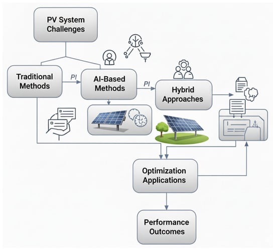 Conceptual framework of optimization methodologies for photovoltaic systems, showing how different approaches address system challenges to achieve performance improvements (PI) through specific applications.