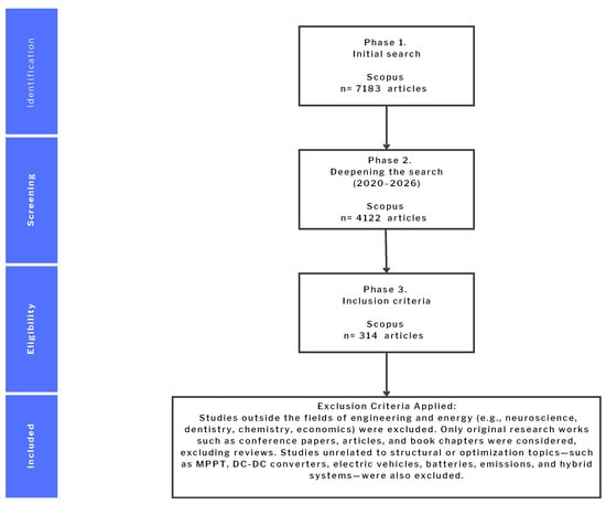 - Conduct a comprehensive search: Databases such as Scopus, Web of Science and ScienceDirect are queried using advanced search strategies combining terms like “photovoltaic solar system”, “optimization”, “structure”, “efficiency”, and metaheuristic algorithms.