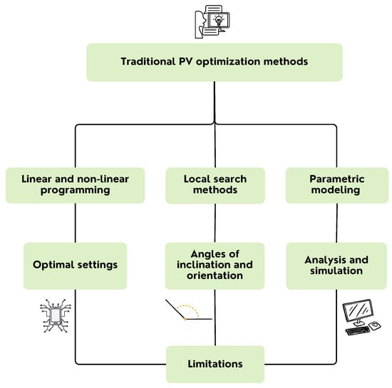 In this context, the application of traditional optimization methods provides robust, interpretable, and often computationally efficient solutions. These methods can significantly contribute to tailoring PV system configurations to specific technical, environmental, and economic constraints, thereby enhancing their attractiveness, especially in cost-sensitive or remote deployment scenarios. This review focuses on such methods and their practical relevance to real-world PV system challenges.