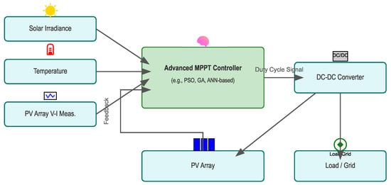 Moreover, the rise of artificial intelligence and algorithmic approaches has enabled a paradigm shift in the modeling and control of PV systems [,]. Techniques such as neural networks, fuzzy logic, genetic algorithms, and metaheuristic optimization have been applied not only to parameter identification but also to the design of maximum power point tracking (MPPT) schemes, often outperforming classical methods like Perturb and Observe in terms of adaptability, noise tolerance, and real-time responsiveness [,]. While these algorithmic models typically demand greater computational resources, they offer substantial advantages in terms of flexibility and dynamic decision-making [].