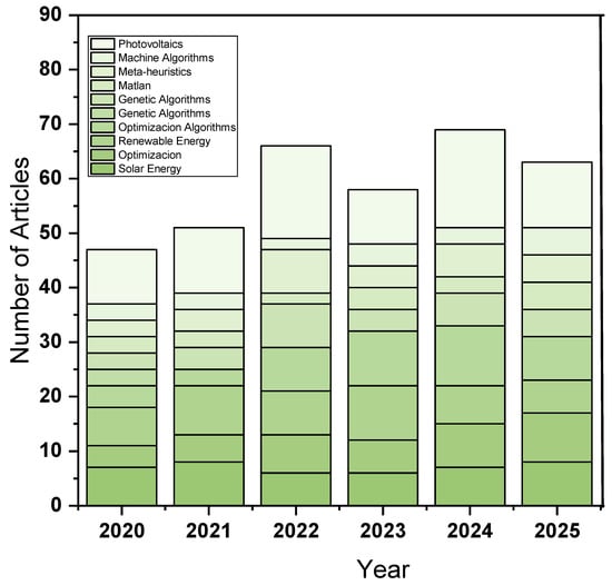 In the current context of environmental crisis, fossil fuel depletion, and the urgent need for energy transition, the development of clean and sustainable technologies has become a central focus in public policy, technological innovation, and scientific research [,]. Within this framework, photovoltaic solar energy (PV) has emerged as one of the most promising alternatives due to its renewable nature, low environmental impact during operation, and scalability for both urban and rural applications [,]. This review encompasses optimization studies applied to the full spectrum of PV system configurations, including standalone (off-grid), grid-connected (on-grid), and hybrid systems (e.g., integrated with storage or other renewable sources), with a focus on methodologies that enhance their structural, operational, and economic performance. Distributed generation, local energy storage, and the decreasing cost of photovoltaic modules have further fueled the sustained growth of this technology in recent years [,].