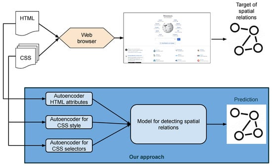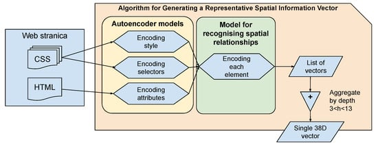 The approach is based on encoding parts of HTML and CSS using autoencoders made and trained for this paper. This step translates string inputs into corresponding vectors suitable for further processing within machine learning models based on neural networks. The second part of the approach combines different segments of the source code for each web page element to create a relevant vector per element, which can then be used to identify spatial relationships. The scheme of the approach can be seen in Figure 1.