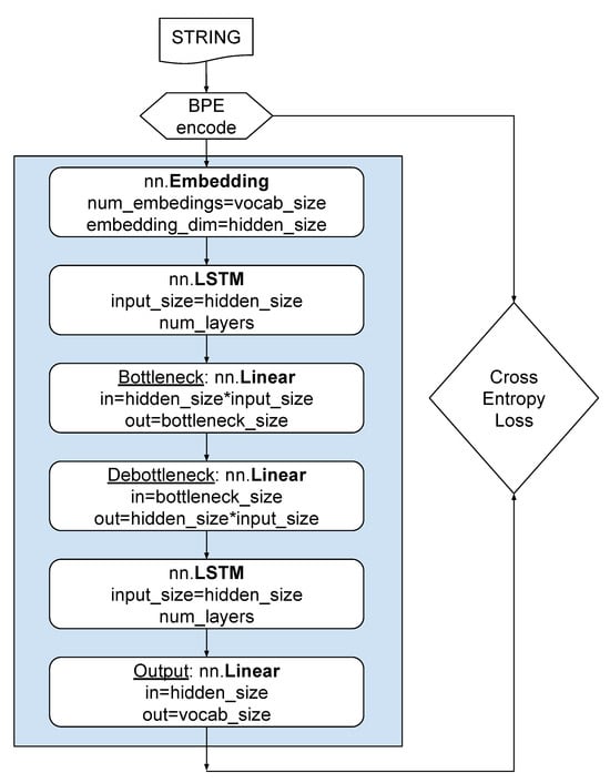 The model’s output has the shape . Here, refers to the batch size used during training, is the length of the BPE sequence after padding (all strings have a uniform length after encoding), and represents the size of the BPE token vocabulary. This output signifies the probability that each token from the given vocabulary appears at every position within the sequence. A visual representation of this autoencoder’s scheme can be found in Figure 3.