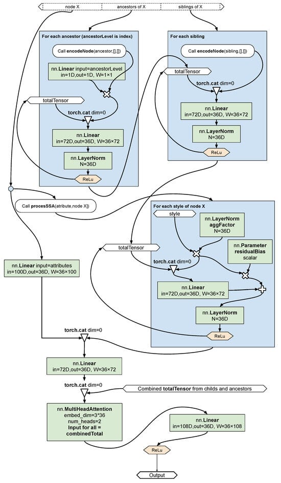 Figure 4 illustrates the schema for the encodeNode method. This method takes three main parameters. The first parameter represents the node to be encoded, including its tensor of encoded attributes and arrays of tensors for both encoded styles and selectors. The second parameter is a list of all the parent nodes, each parent containing the same data structure as the first parameter. Finally, the third parameter is a list of all neighbor nodes, formatted identically to the second parameter.