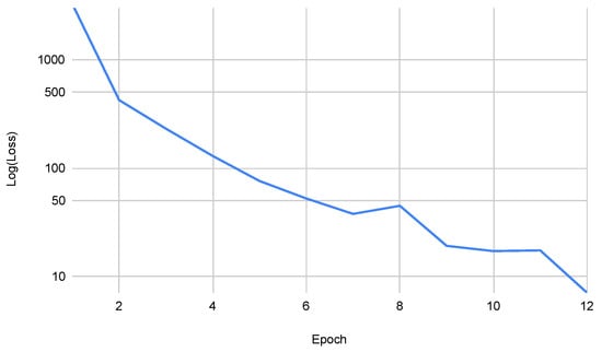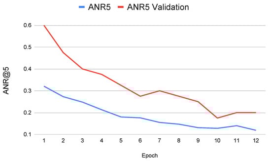 The utility model (the simple neural network for preparing vectors for comparison) was trained for 12 epochs. The training results are shown in Figure 22 and Figure 23. These graphs indicate that training over epochs reduces the model’s error, and validation with the ANR top 5 metric confirms that the model achieves improved performance.