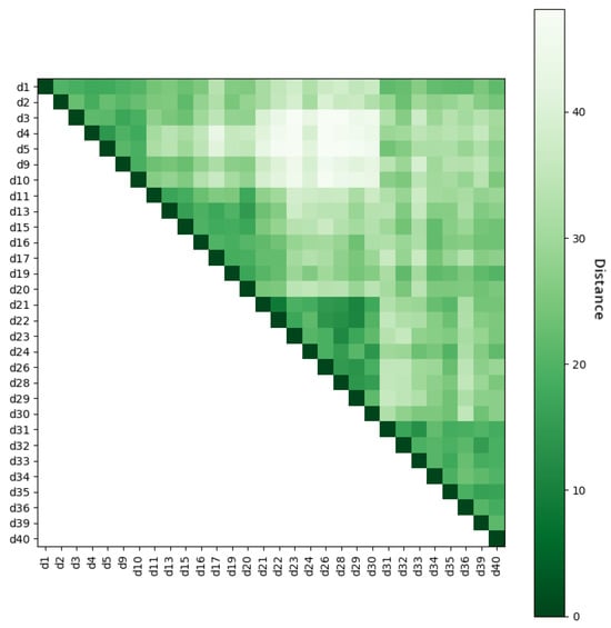 This matrix shows the distances between web pages using our method. Greener values indicate a smaller distance, meaning higher similarity.