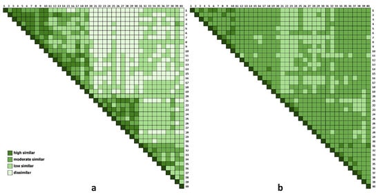 This image presents the similarity matrix from the original paper [] by Bozkir et. al. (a) User evaluation results: Here, greener squares indicate more similar pages, reflecting user perceptions. (b) Best configuration from proposed method: This shows the similarity matrix generated by the best configuration of the method proposed in their paper. Reprinted from International Journal of Human-Computer Studies, Vol 110, Ahmet Selman Bozkir, Ebru Akcapinar Sezer, Layout-based computation of web page similarity ranks, Pages No. 95-114, Copyright (2018), with permission from Elsevier.