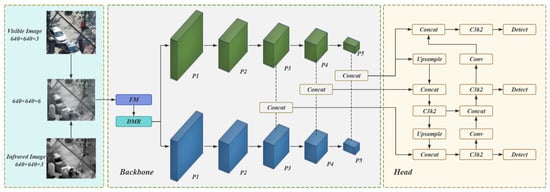 - Cao, Y.; Bin, J.; Hamari, J.; Blasch, E.; Liu, Z. Multimodal Object Detection by Channel Switching and Spatial Attention. In Proceedings of the IEEE/CVF Conference Computer Vision Pattern Recognition Workshops (CVPRW), Vancouver, BC, Canada, 17–24 June 2023; pp. 403–411. [Google Scholar] [CrossRef]