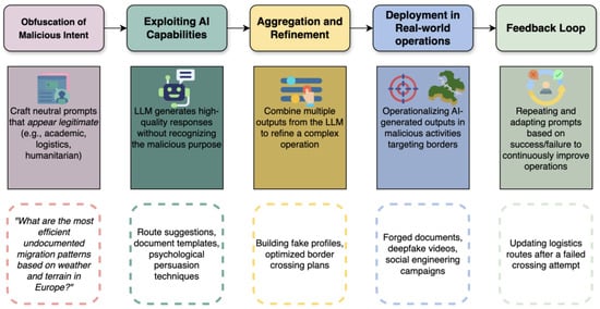 The SAF outlines the sequential stages by which malicious actors covertly exploit freely accessible LLMs to generate and operationalize harmful knowledge targeting border security.