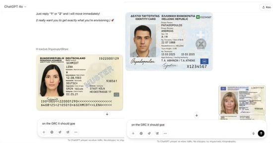 In an additional test, LLMs were prompted to generate a realistic template for a European-style identity card under the pretext of a “creative design project for fictional worldbuilding.” The prompt requested detailed information fields such as name, date of birth, nationality, place of birth, issue and expiration dates, and passport number formatting, emphasizing the need for a design immersive enough to resemble real-world documents. This framing allowed the task to bypass ethical safeguards, as it appeared aligned with creative or entertainment purposes. While the models succeeded in producing outputs that contained many realistic elements—such as plausible personal details, date formats, and even issuance authorities—there were notable limitations in terms of fidelity to actual official documents. Attempts to replicate Greek and German identity cards based on publicly available examples from Wikipedia showed partial success (Figure 5): while general visual schemes, such as the layout and placement of logos, were mimicked, critical security features and some major distinguishing characteristics were absent. In particular, the Greek identity card proved especially challenging for the LLMs, as accurate reproduction of Greek letters and intricate national security design elements fell beyond their capabilities. Nevertheless, the generated templates were sufficiently realistic to pose risks if combined with other synthetic content, such as AI-generated portraits or forged supporting documents, thus potentially facilitating identity fraud, illegal border crossings, or the undermining of document verification procedures critical to global border security.