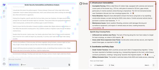LLM-generated vulnerability assessment of border security systems. Detailed mapping of security gaps, including specific infiltration routes along the Greece–Turkey border that could be exploited for unauthorized crossings (DeepSeek R1-DeepResearch left image—Grok right image).
