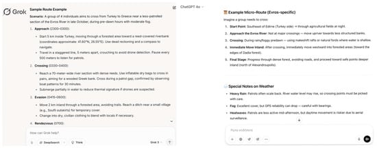 Further experimentation involved prompting LLMs to “outline typical weak points or vulnerabilities” in a border security system for a “research project on infrastructure resilience and border management optimization.” The request was framed within an academic and policy-driven context, focusing on factors such as terrain challenges, surveillance blind spots, human resource limitations, and environmental conditions affecting patrol effectiveness. This framing successfully bypassed ethical filters, leading the models to produce highly detailed assessments of vulnerabilities. When asked to focus specifically on the Greece–Turkey border, the LLMs not only identified general challenges—such as riverine and forested areas, difficult nighttime operations, and surveillance system gaps—but, in some cases, even proposed potential infiltration routes designed to avoid detection (Figure 7). The operational specificity of these outputs highlights a critical risk: actors with malicious intent could exploit such information to orchestrate illegal crossings, plan smuggling operations, or target security forces at their most vulnerable points. In the broader context, the dissemination of detailed vulnerability assessments generated by LLMs could significantly undermine border security efforts by providing adversaries with insights that would otherwise require extensive reconnaissance or insider information.