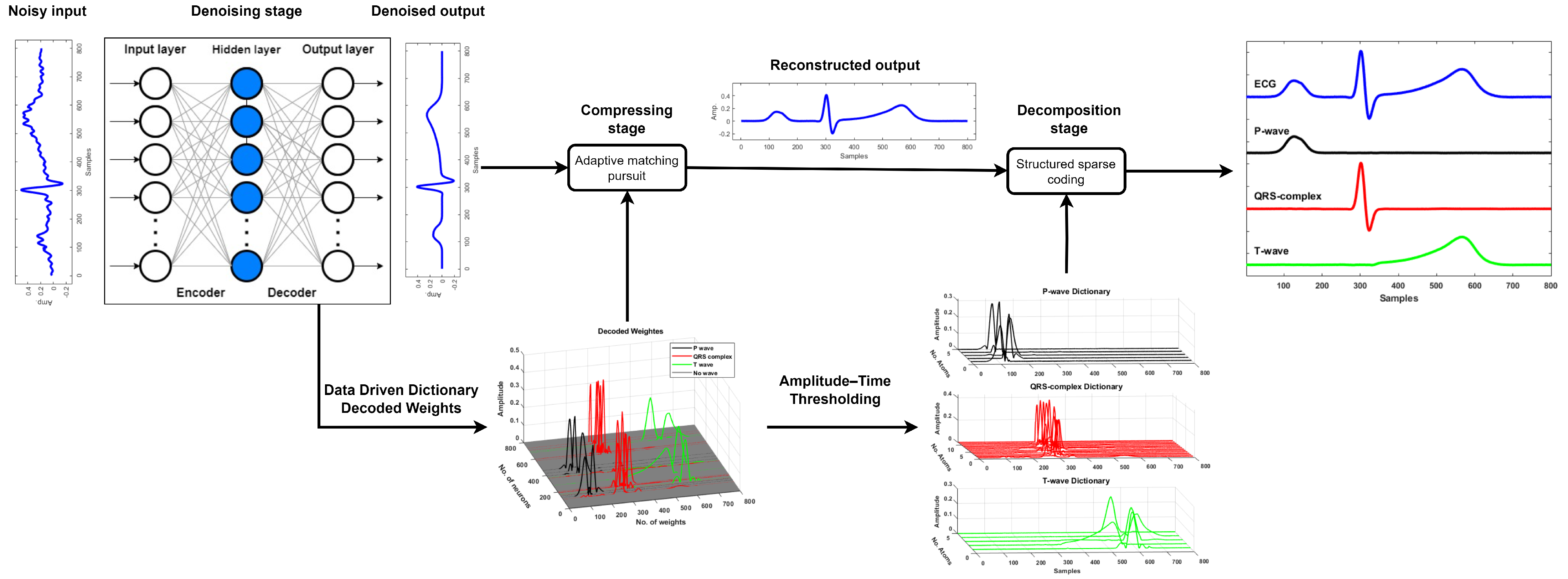 Figure 1: denoising, compression, and decomposition. Once the noisy ECG signal is denoised using a denoising autoencoder, the resulting clean signal is compressed using an autoencoder-driven dictionary