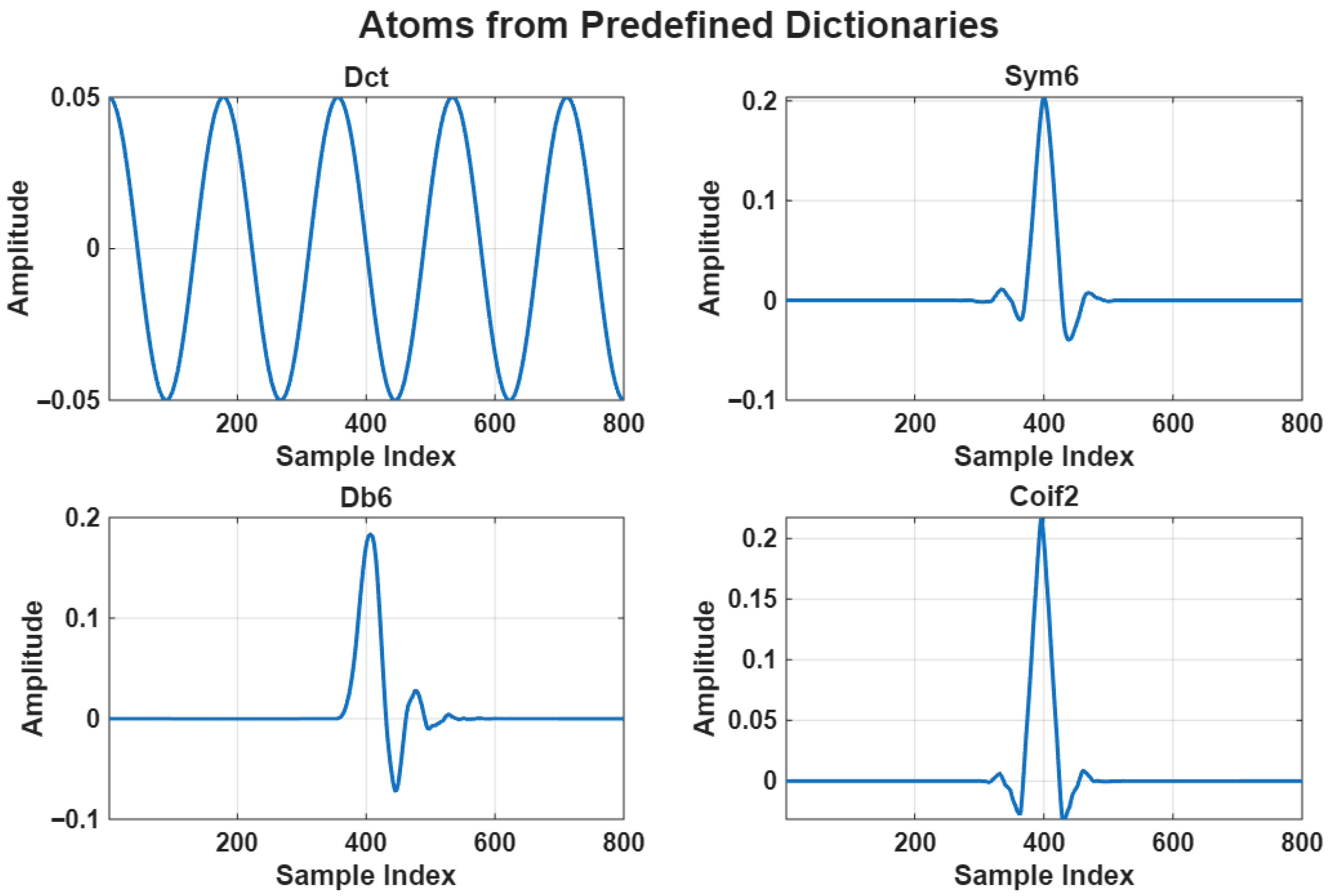 The grouping was carried out through an amplitude–time thresholding technique, which identifies and assigns atoms that make significant contributions to each morphological component based on their temporal location and amplitude. Matching pursuit was applied using the full dictionary to estimate a sparse coefficient vector