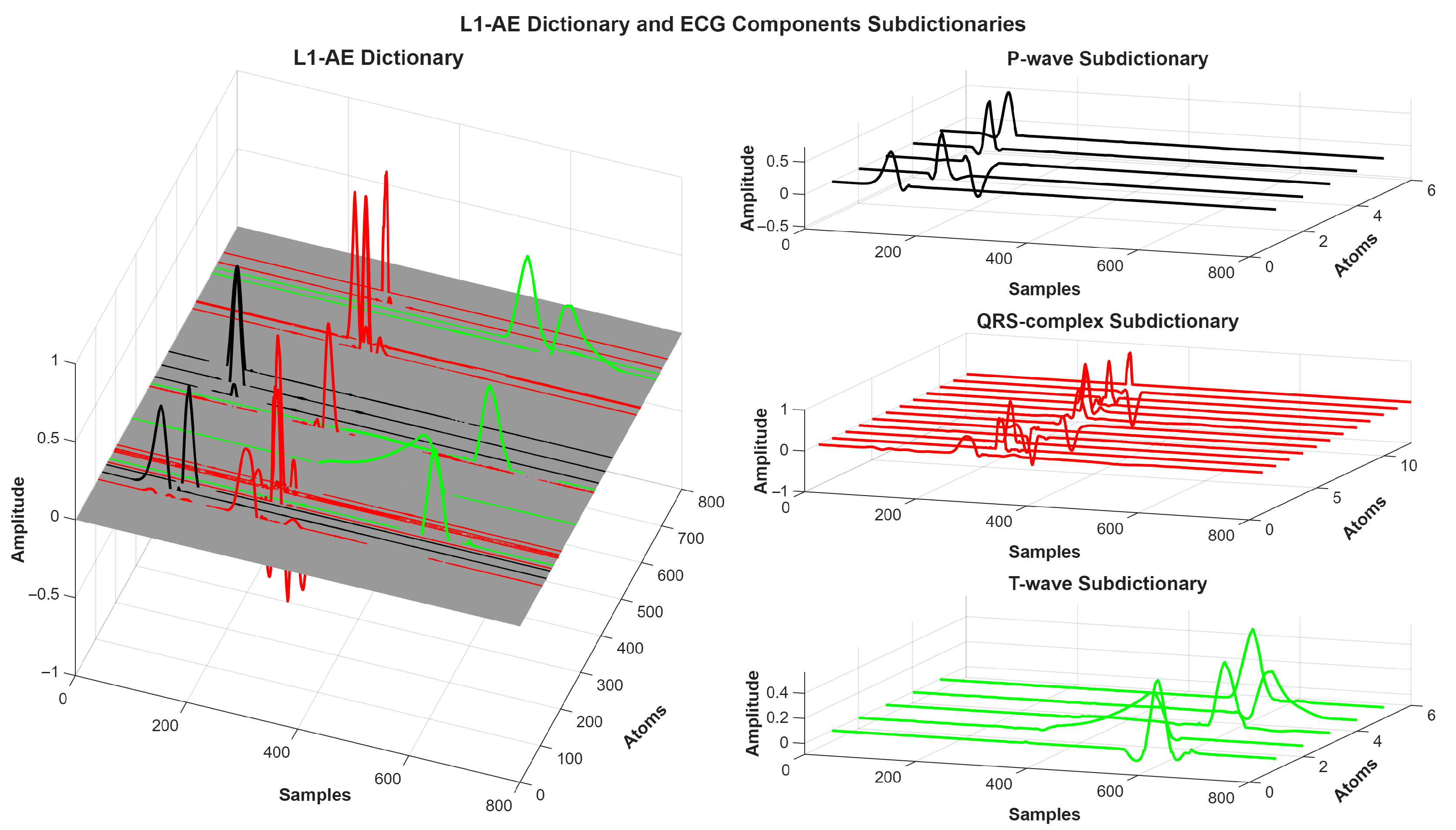 . These sub-dictionaries are formed by thresholding the learned weights based on both the amplitude and temporal location of each atom in relation to the known ECG morphology. The amplitude–time threshold is used to identify and group atoms that significantly contribute to each waveform component, enabling a morphology-aware separation of the ECG signal. This decomposition is also carried out using the matching pursuit algorithm.