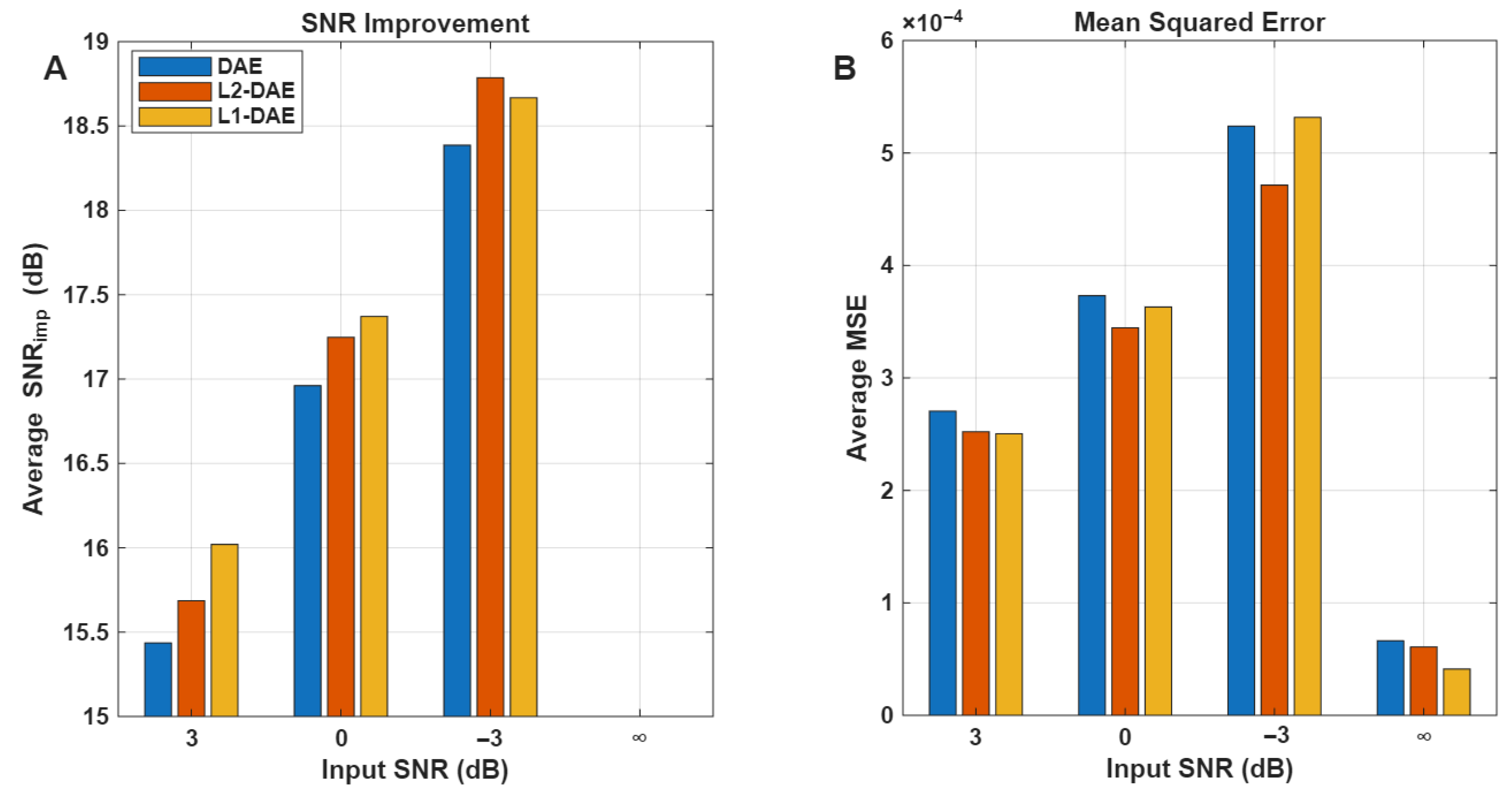 The performance of the denoising stage was evaluated for the DAE models with and without the weight regularization technique at different input SNR levels.