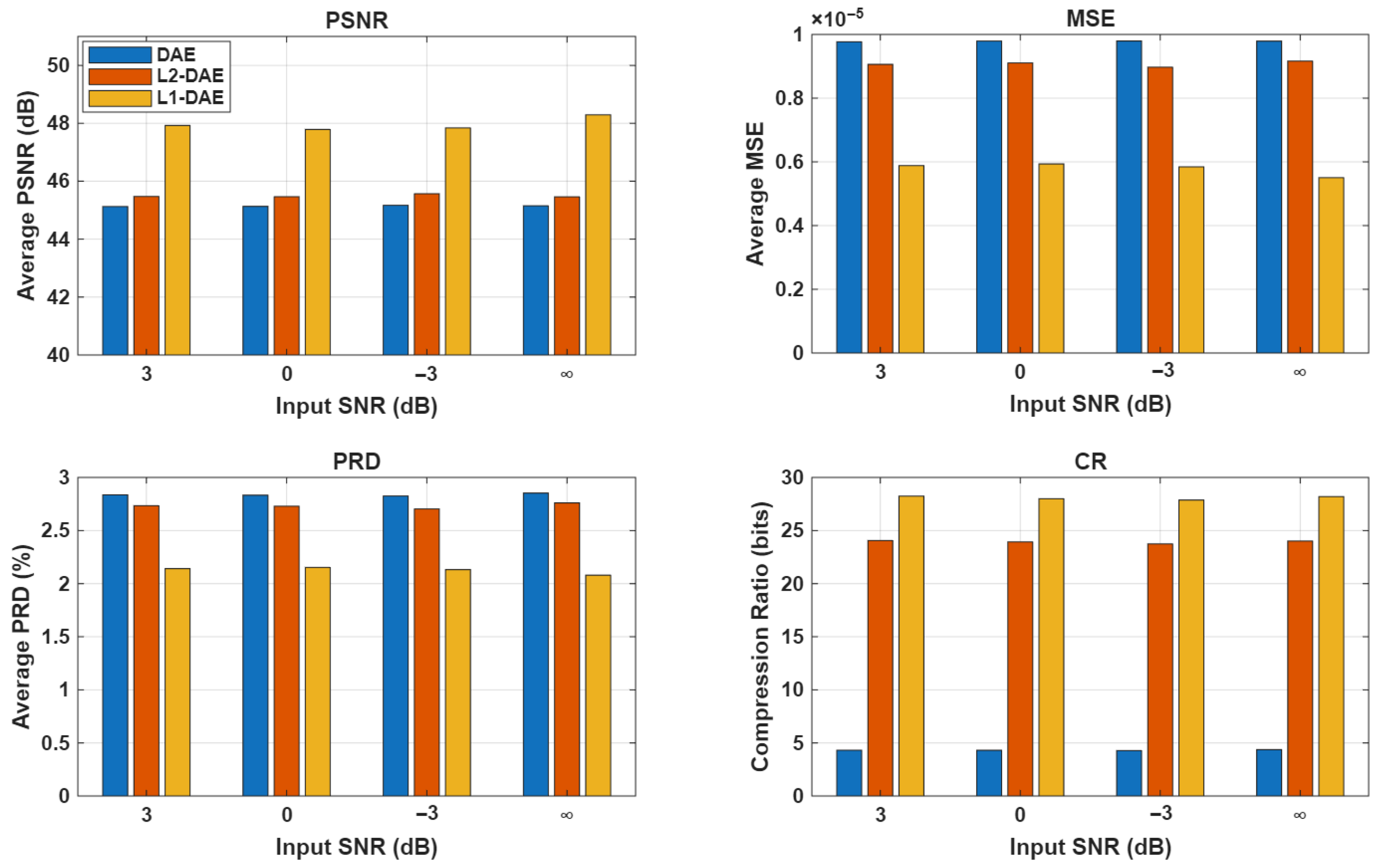 Figure 8 shows that the L1-AE model, which was trained using weight regularization, effectively compressed the denoised ECG segment with a high compression ratio (CR = 28), obtaining the lowest MSE and highest PSNR for all input